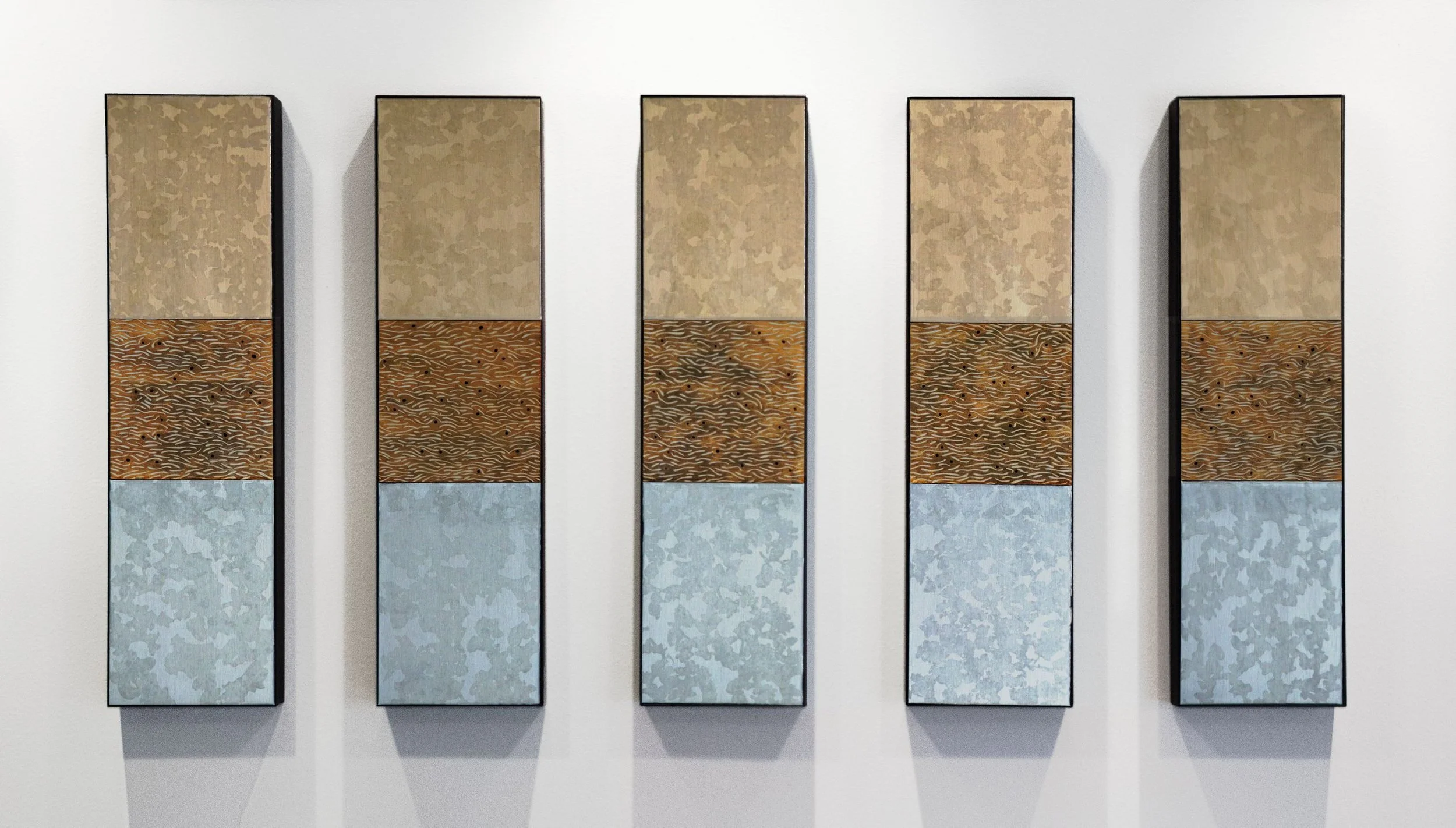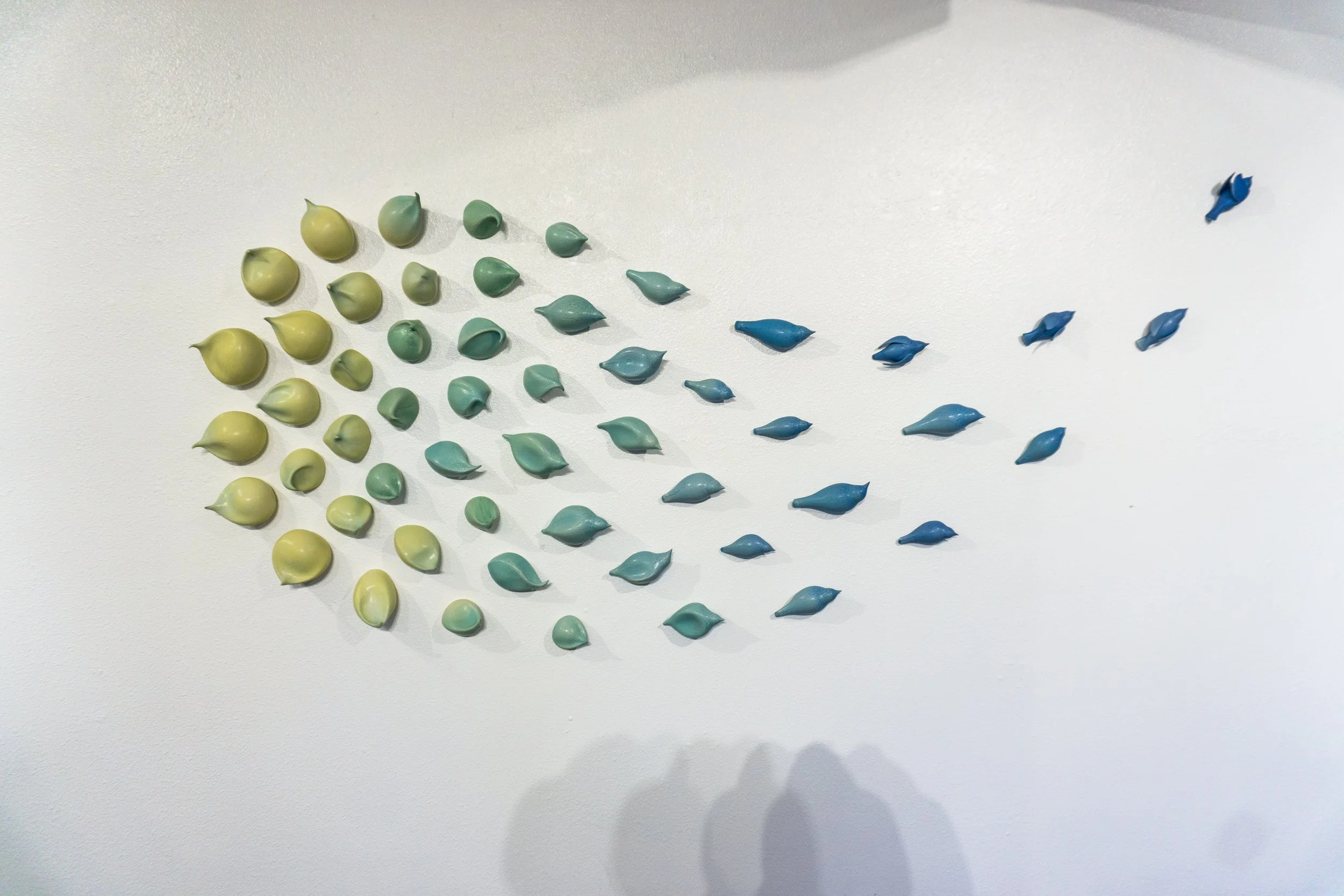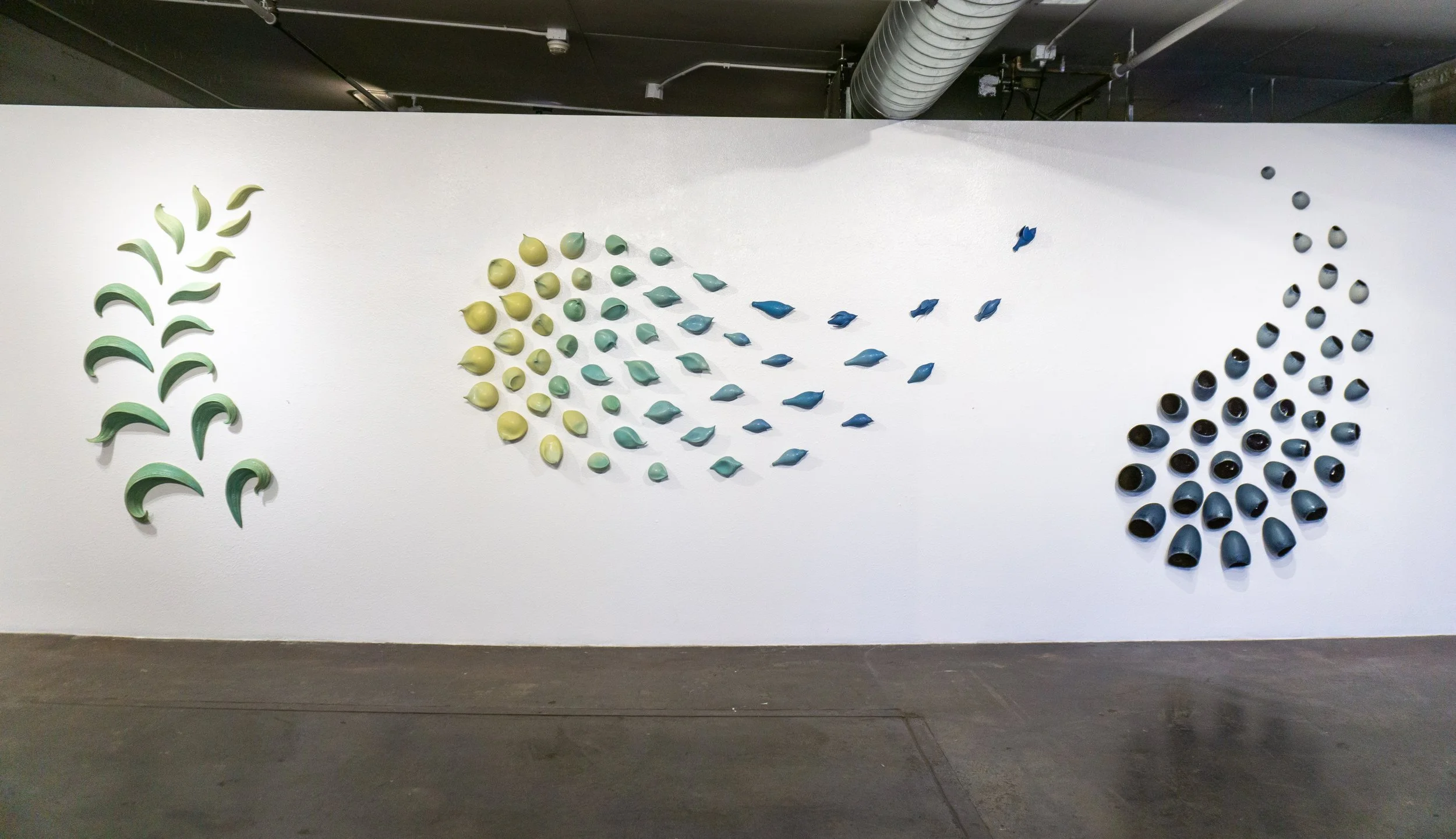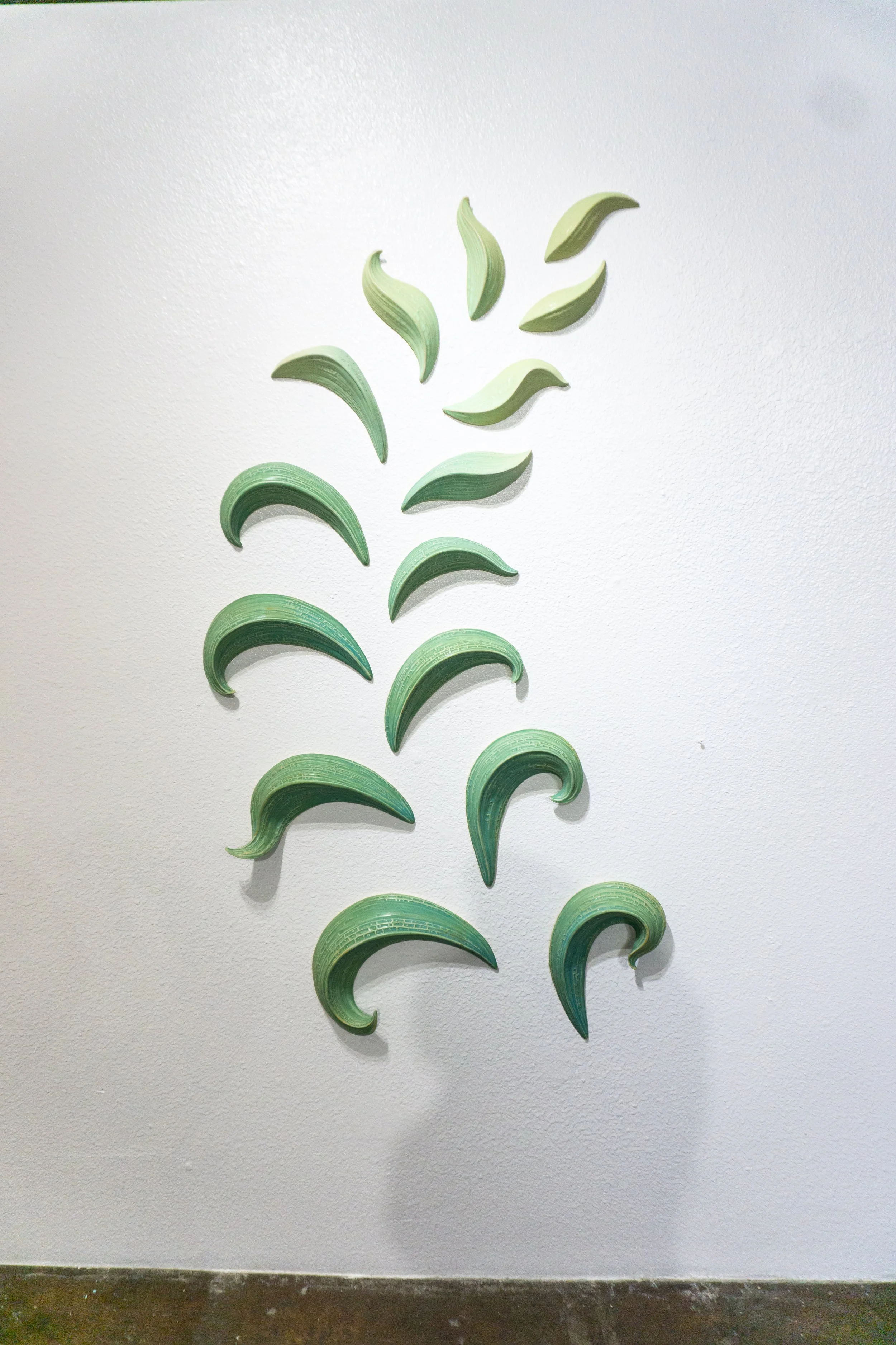 With a background in biology, images relating to science and nature are consistently present in JULIE ANDERSON’s work. Her latest wall sculptures study how time affects the physical attributes and ecology of plants and animals. She explores how these beings move, grow, age, and die. Veins deepen, leaves shrivel, and flowers turn to seeds relinquishing their offspring to nourish a new generation of birds or mammals.