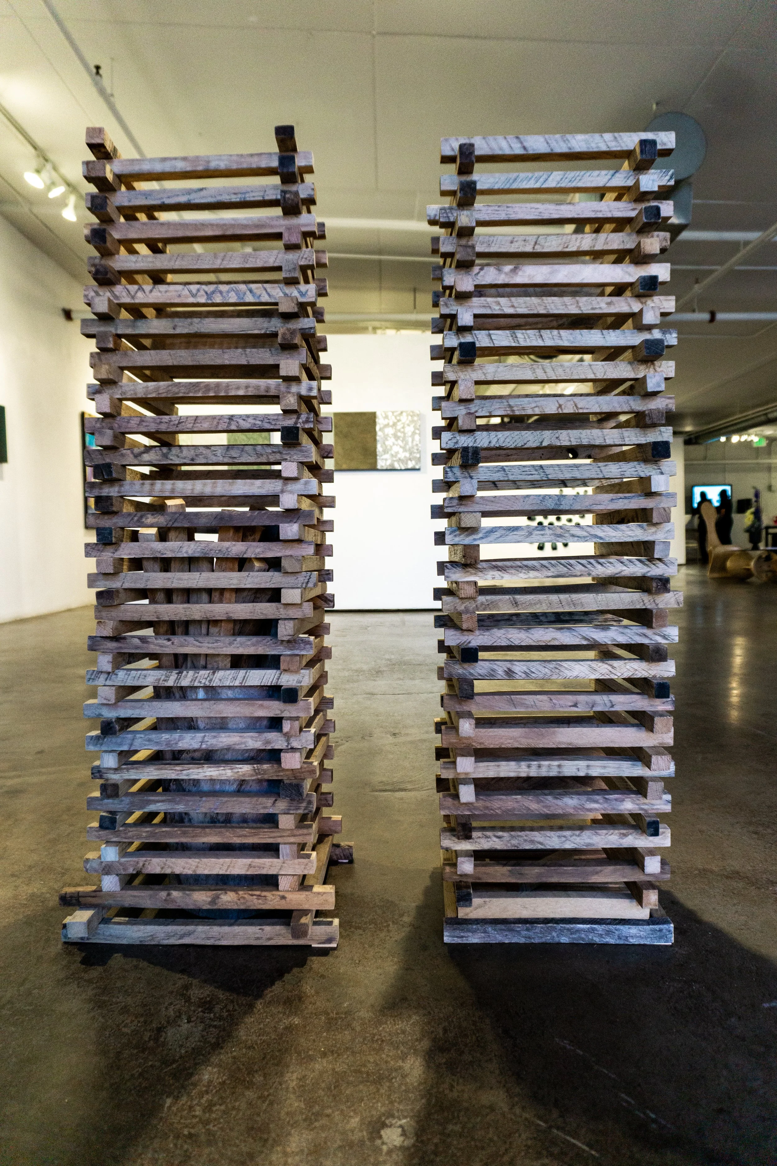 In his latest series, MARK PENNER-HOWELL is incorporating the passage of time as an element in the creation of the work - not to comment on time as a concept, but utilizing it as a medium. The paintings are a palimpsest of messages built up on reclaimed lumber, which were installed around town in places where they would accumulate graffiti. Later, the panels were brought into the studio and additional text and images were added to tease some beauty out of the noise and chaos of daily life.