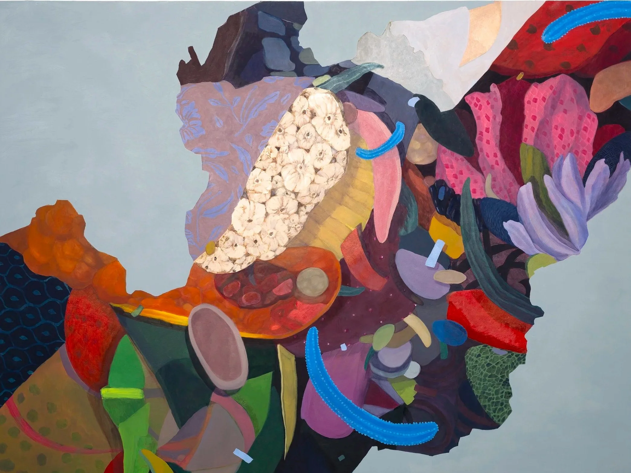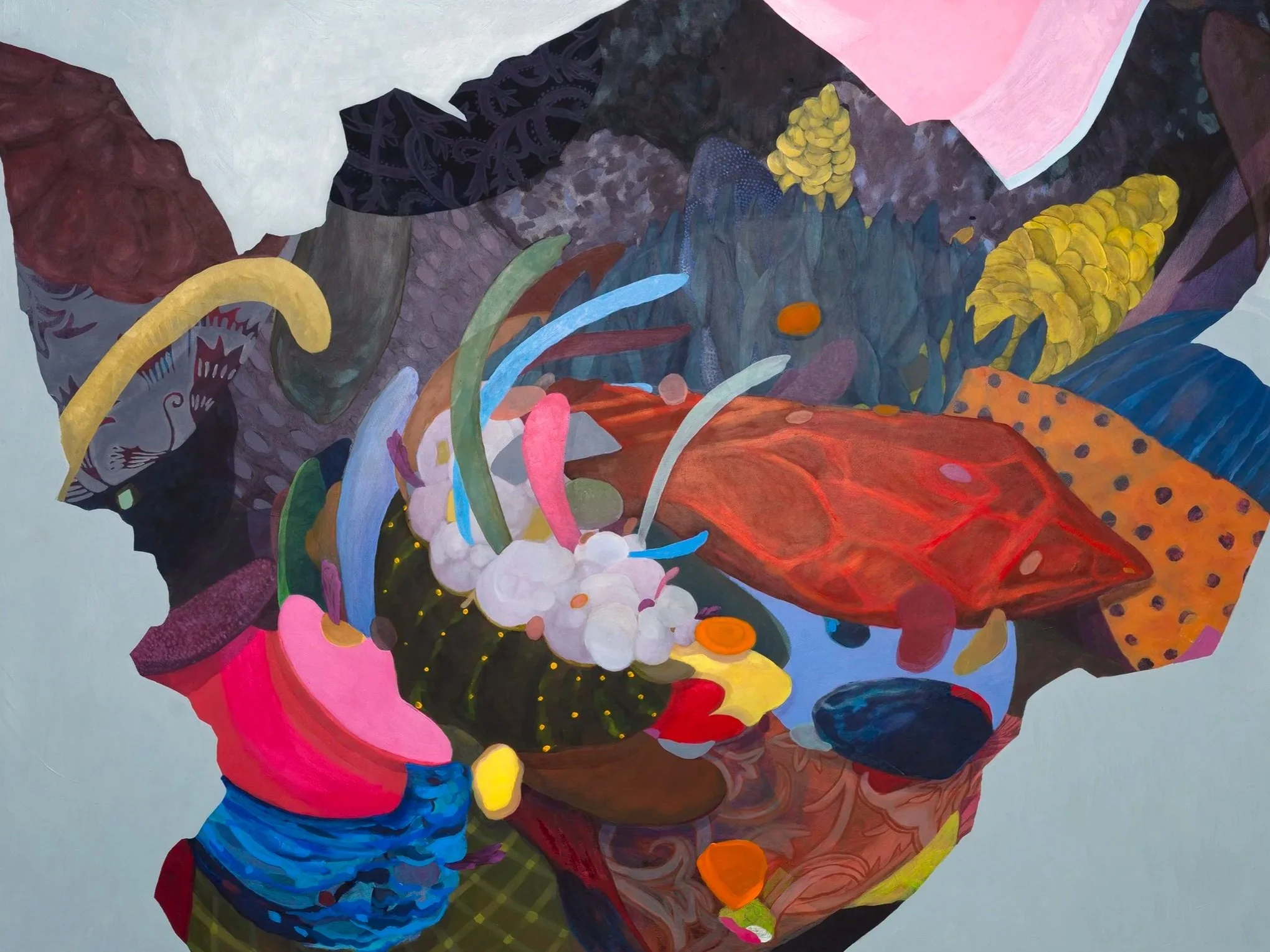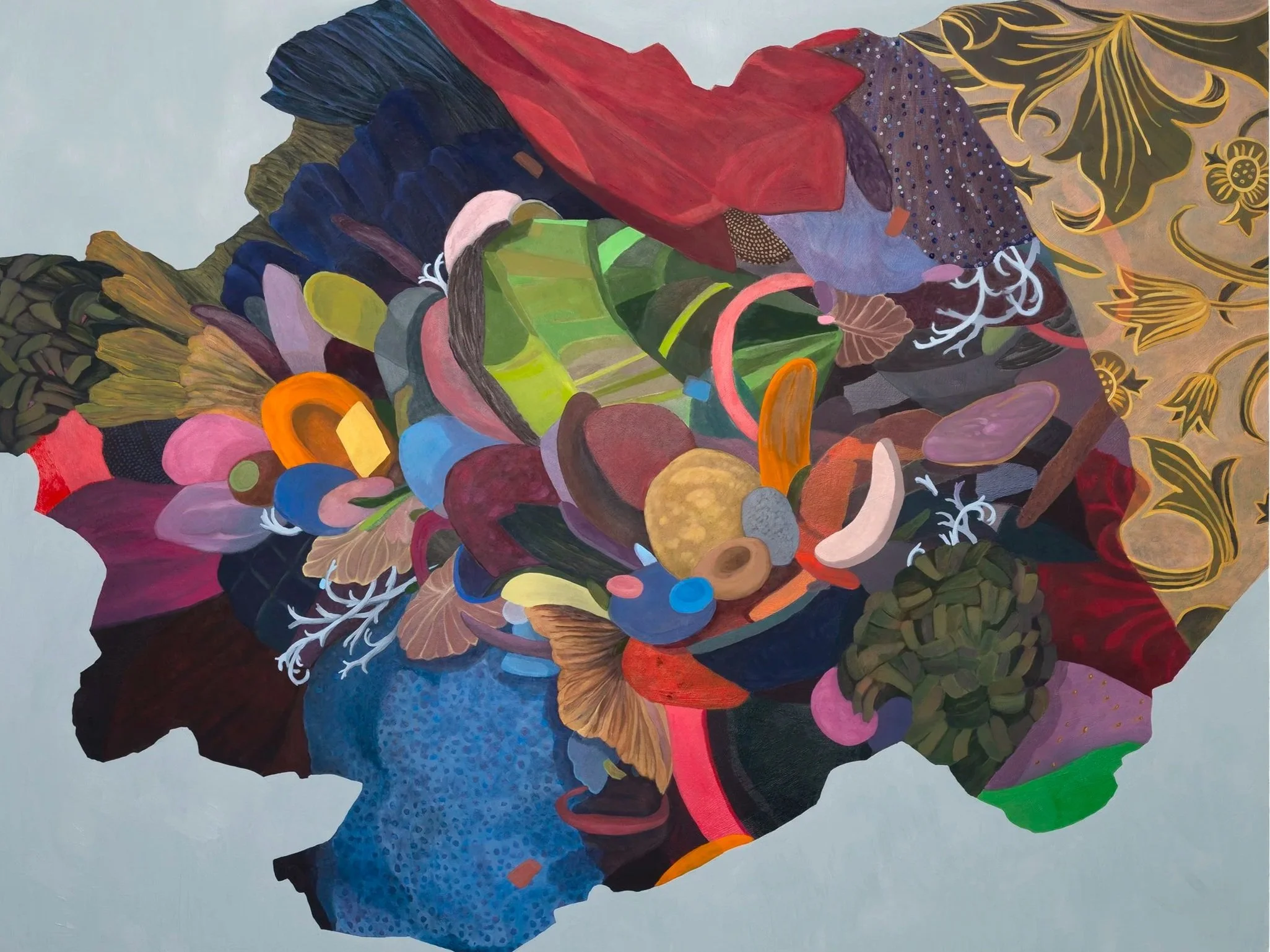 Through my work, I question preconceived notions of nature and beauty and ask viewers to consider the relationship between accumulation and the feeling of alienation from nature. My approach is decoratively abstract. The bouquet-like arrangements found in my compositions function as metaphors as well as resemble creatures or forms from nature. I incorporate a hybridization of aesthetic orders: synthetic and organic, flora and fauna, and bodily and constructed forms.